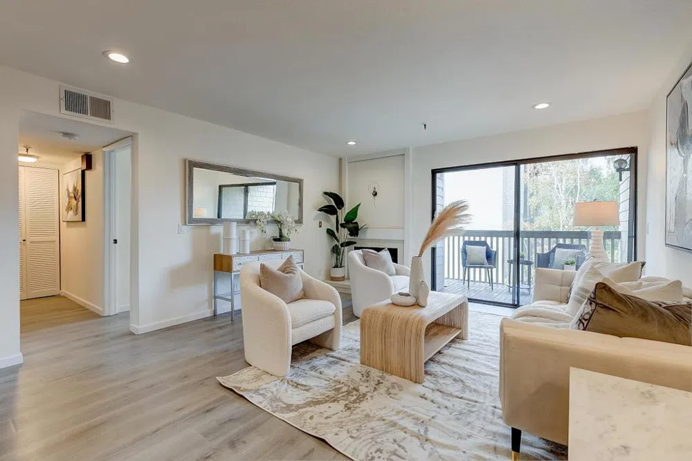 Bright and updated 2b2b condo in the highly desirable Old Mill community. Both spacious bedrooms have their own upgraded bathrooms, located on opposite sides of the condo for added privacy. The gourmet kitchen features modern white cabinets, quartz countertops, a stylish backsplash, and stainless steel appliances. The living room opens to a balcony with unobstructed views. The unit boasts A/C, in-unit laundry, and hard floors throughout. This secured building includes an elevator and assigned under-building parking. The beautiful community offers two pools, a spa, a clubhouse, scenic water fountains, and lovely bridges and decks for leisurely strolls. Conveniently located within walking distance to Whole Foods, Safeway, Trader Joes, Target, Walmart, restaurants, a fitness center, and a movie theater. A short drive to tech companies like Google and Microsoft. Top-rated Los Altos Schools: Covington Elementary, Egan Junior High, and Los Altos High (buyer to verify eligibility).