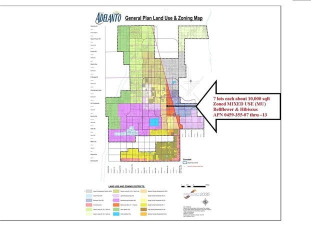 Seven Contiguous Lots - each about 10,000 sqft (75 x 134 or 10,050 sqft each). Recently Re-Zoned for Mixed Use. Many possible uses - check with City of Adelanto. Buy one for $18,500, or all 7 for $129,000. On pavement with utilities nearby. Build Now or Hold for Investment - Buy in the Path of Development. Seller will consider selling individual lots, AND will consider Seller Financing. Submit your offer and let's talk...